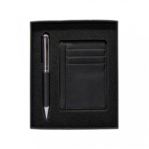 Kit de porta cartões, chaveiro e esferográfica em couro sintético...